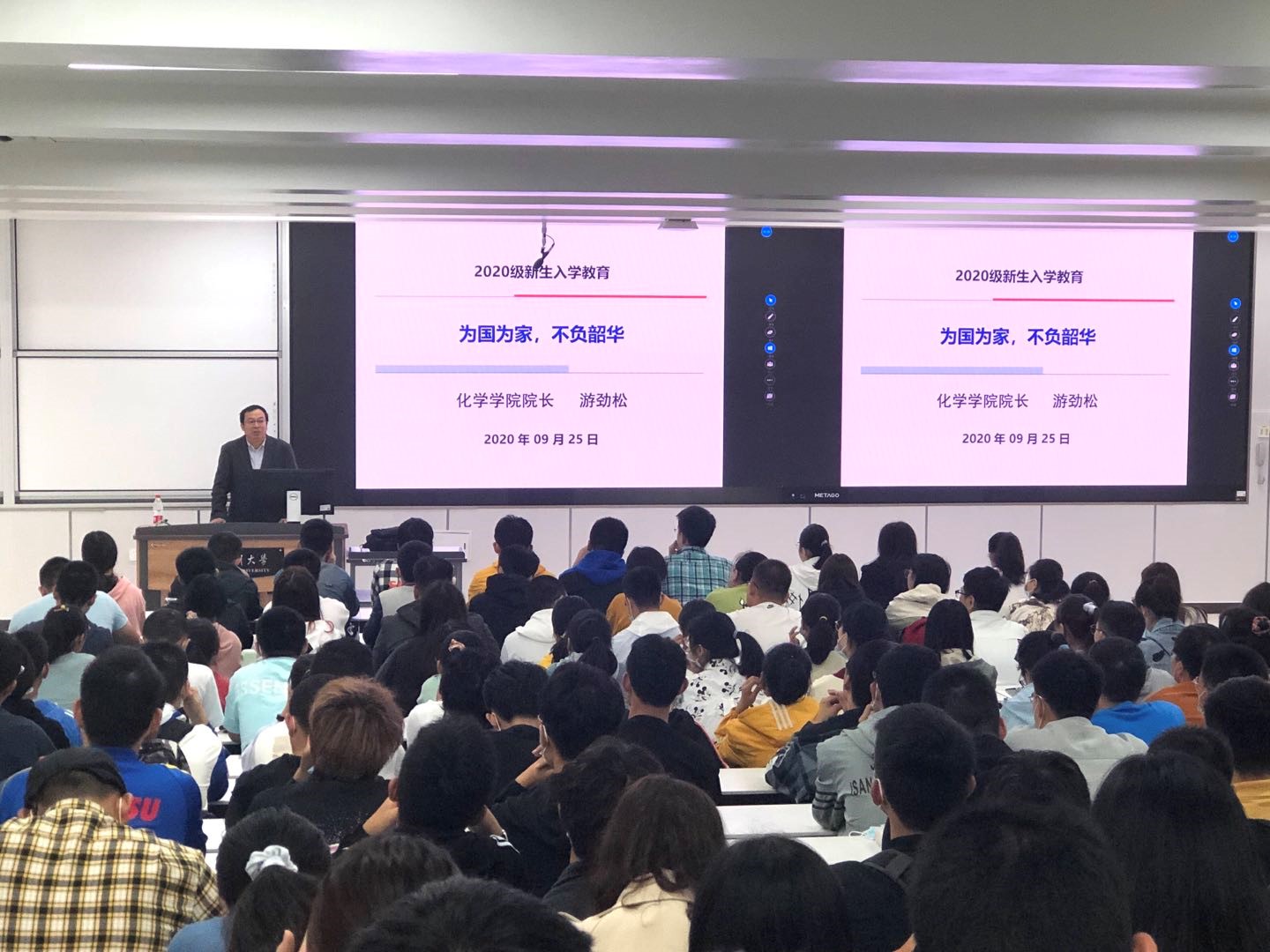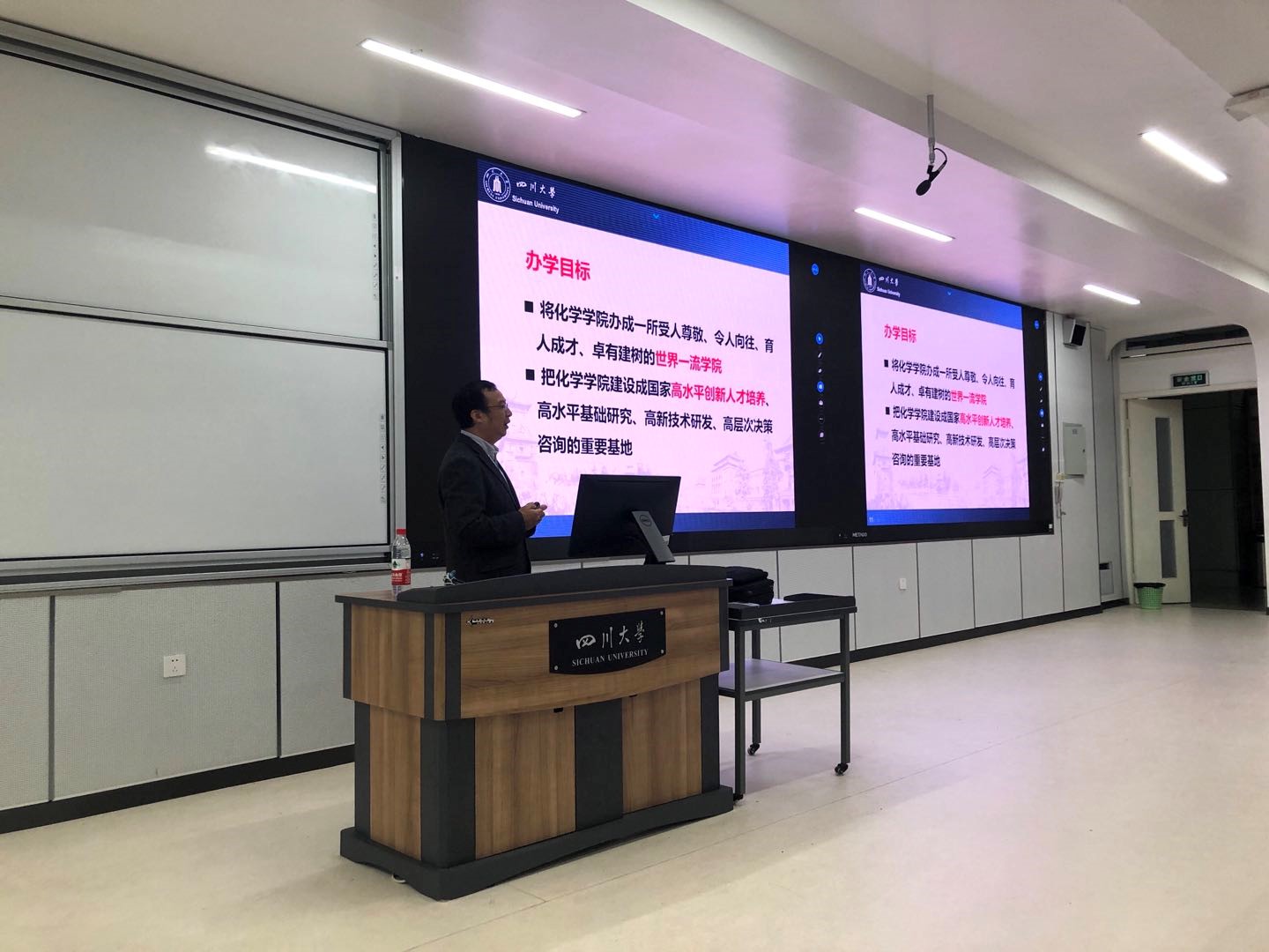 的历史沿革,学院概况、师资力量、科研成果、学科建设、特色发展以及学院近几年取得的成绩向同学们做了系统全面地介绍,并在讲座中引述知名校友经历及成就引导学生对化学专业的正确认识,从自身奋斗引述到国家命运,告诉同学们“读书大是为了国家,小是为了自己”,鼓励同学们珍惜青春,肩负发展使命,心系国家未来,做栋梁之材。游院长勉励学生们要勤修品德,励志成才,努力为中华民族的伟大复兴做出自己应有的贡献。