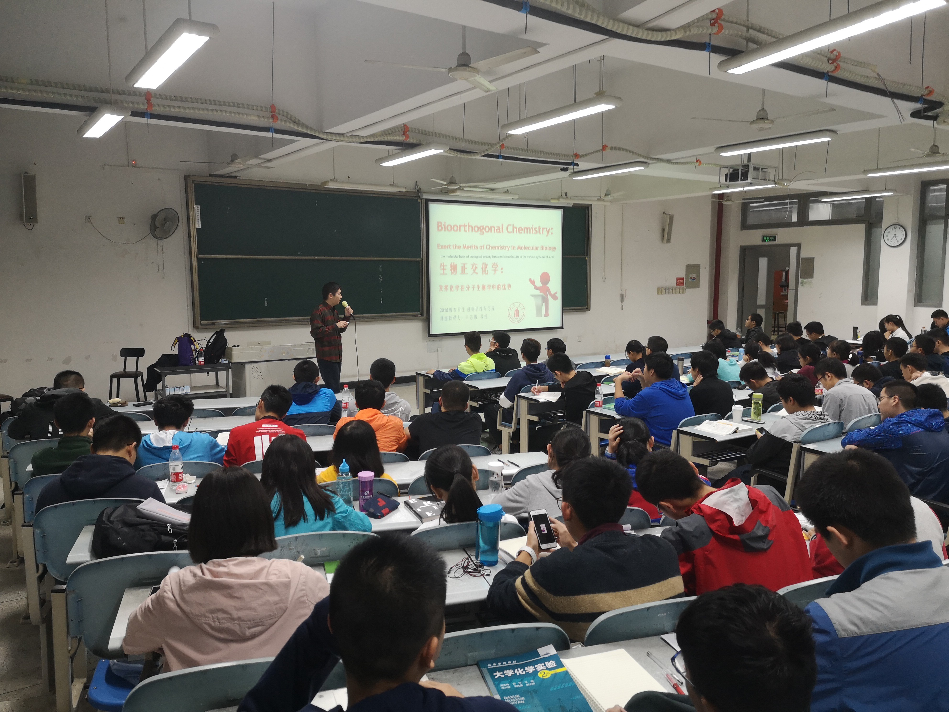 2018级新生带来了“创新思维与交流”系列讲座第五讲:生物正交化学,有力地说明了化学在分子生物学中的优势。