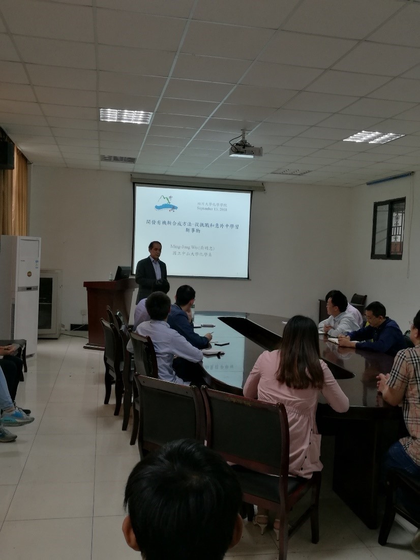 并做了题为“开发有机新合成方法——从挑战和意外中学习新事物”的学术报告,报告中吴明忠教授详细讲述了所领导的课题组发展的三类化合物的合成研究,包括呋喃萘醌类化合物、吡唑并[1,5-C]吡啶类化合物、3-酰基苯并噻吩类化合物的合成。