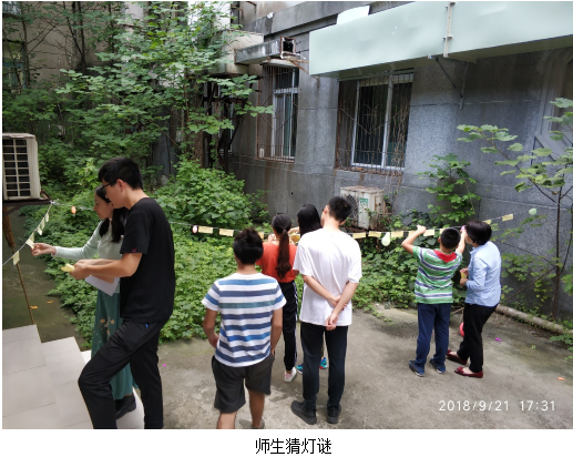 在晚会正式开始前,研究所老师同学们首先进行了猜灯谜的游戏。灯谜难度虽大,但大家思索的热情却更高。晚上6点,晚会正式开始,唐松柏同学担任此次晚会主持人,介绍了中秋节起源、研究所的历史与现状以及举办此次晚会的目的与意义。研究所内成员各展其才,进行了唱歌、跳舞、小品、吉他演奏、架子鼓演奏等才艺表演。表演结束后,李顺同学担任小组比赛主持人。同学们被随机分为五组,每位老师带领一组。小组进行了知识问答、配音游戏、你比我猜、抱团游戏、谁是卧底等比赛,并进行打分。激烈的竞争的同时伴随着发自内心的欢笑。晚会最后,根据个人猜中灯谜的数量和小组得分颁发了相应奖励,晚会在老师同学们合唱《难忘今宵》的歌声中顺利结束。会后研究所成员进行了合影。