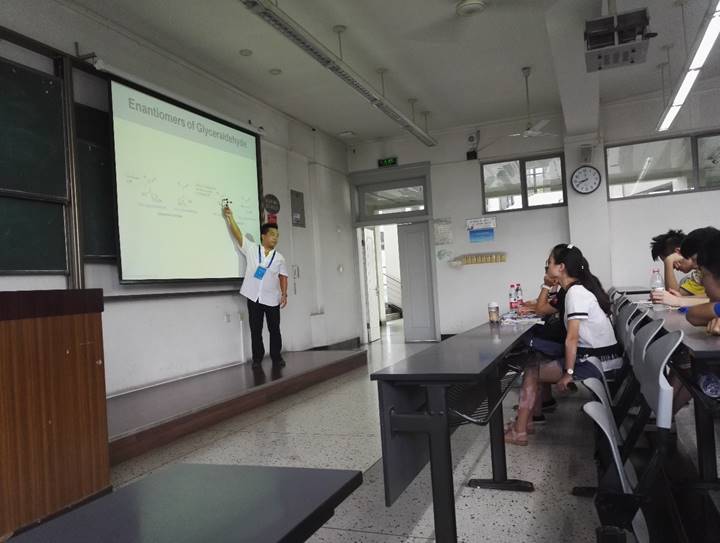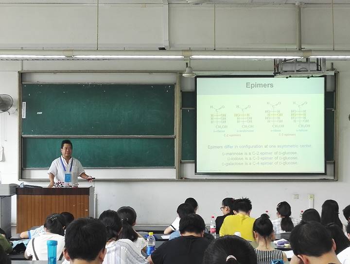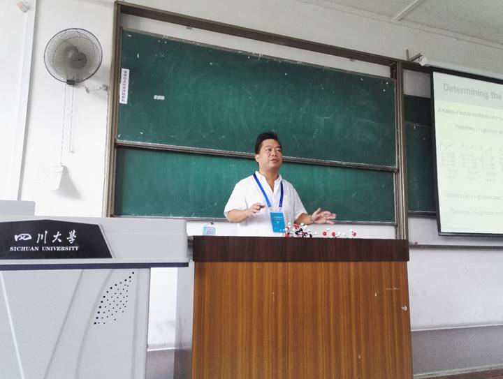 7月10日至7月13日,香港大学化学系的Patrick Henry Toy教授应邀参加2017年四川大学“实践及国际课程周”,在江安校区一教B203教室为同学们带来一门“Organic Chemistry of Biomolecules”课程。Toy教授从糖类、氨基酸、肽和辅酶等在生物学方面有重要作用的有机分子出发,充分结合日常生活实际,生动而又具体地讲解了各种生物大分子的相关知识,让学生了解和理解了有机化学在生物学和生物化学中的作用。