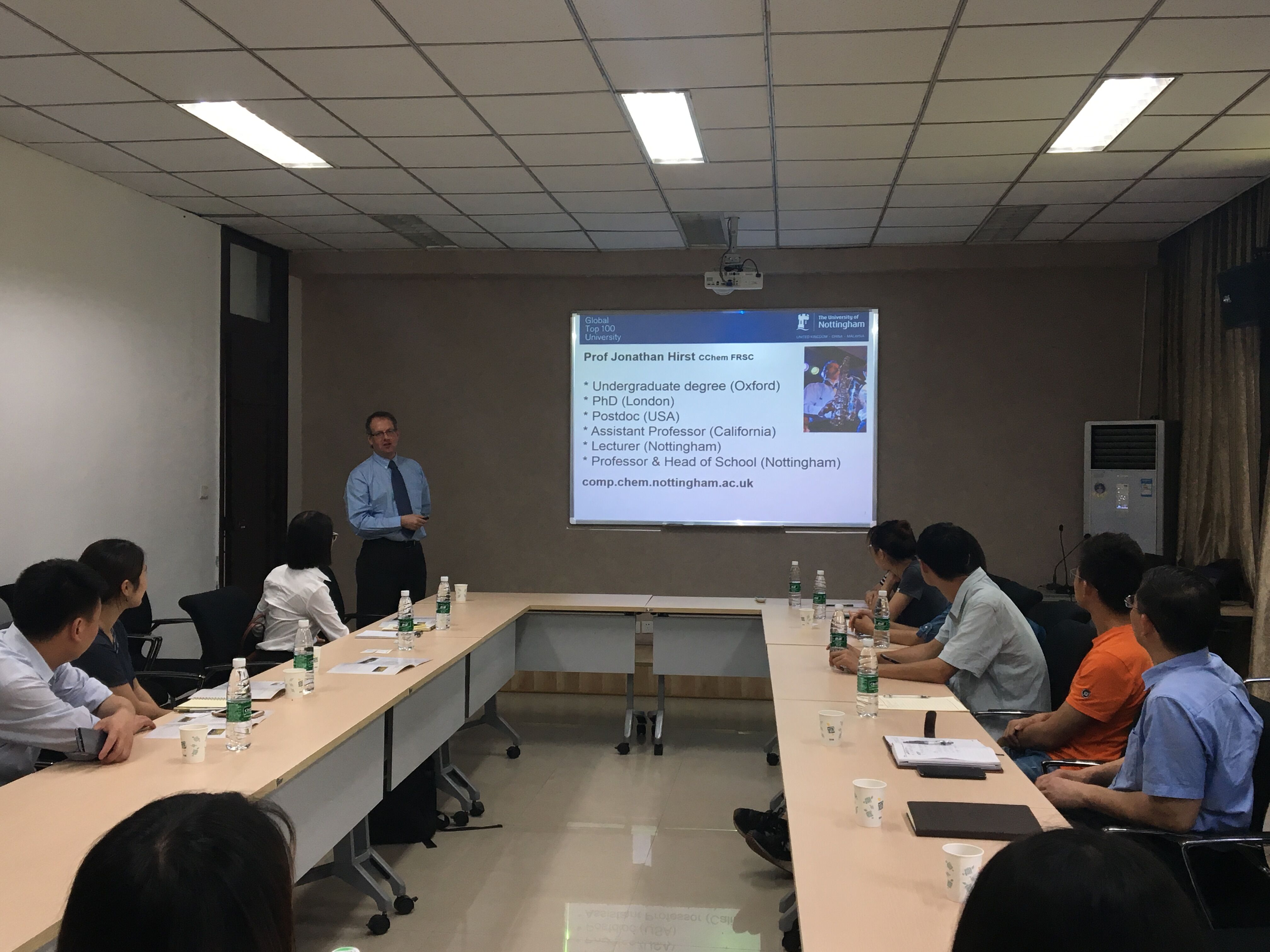 的基本情况做了介绍:诺丁汉大学化学院历史悠久,设施完善,最近又新修了实验中心,为学生创造了良好的科研环境。之后双方就即将签署的3+2学生联合培养协议进行了讨论,学生们提出了有关申请、课程、学分转换及毕业论文等具体问题,Hirst教授对学生提出的问题进行一一解答。最后,双方都对将来的合作表示期待。