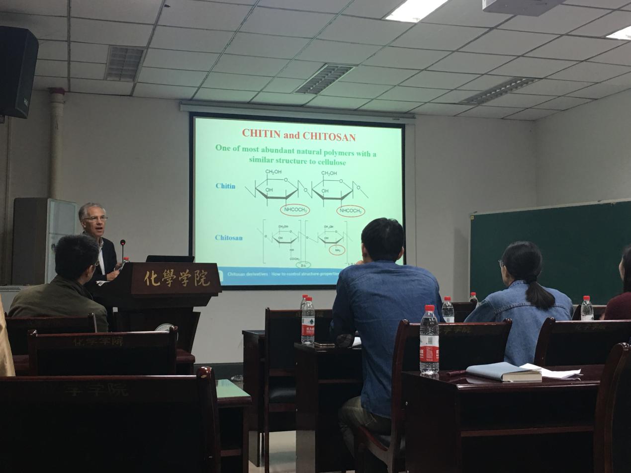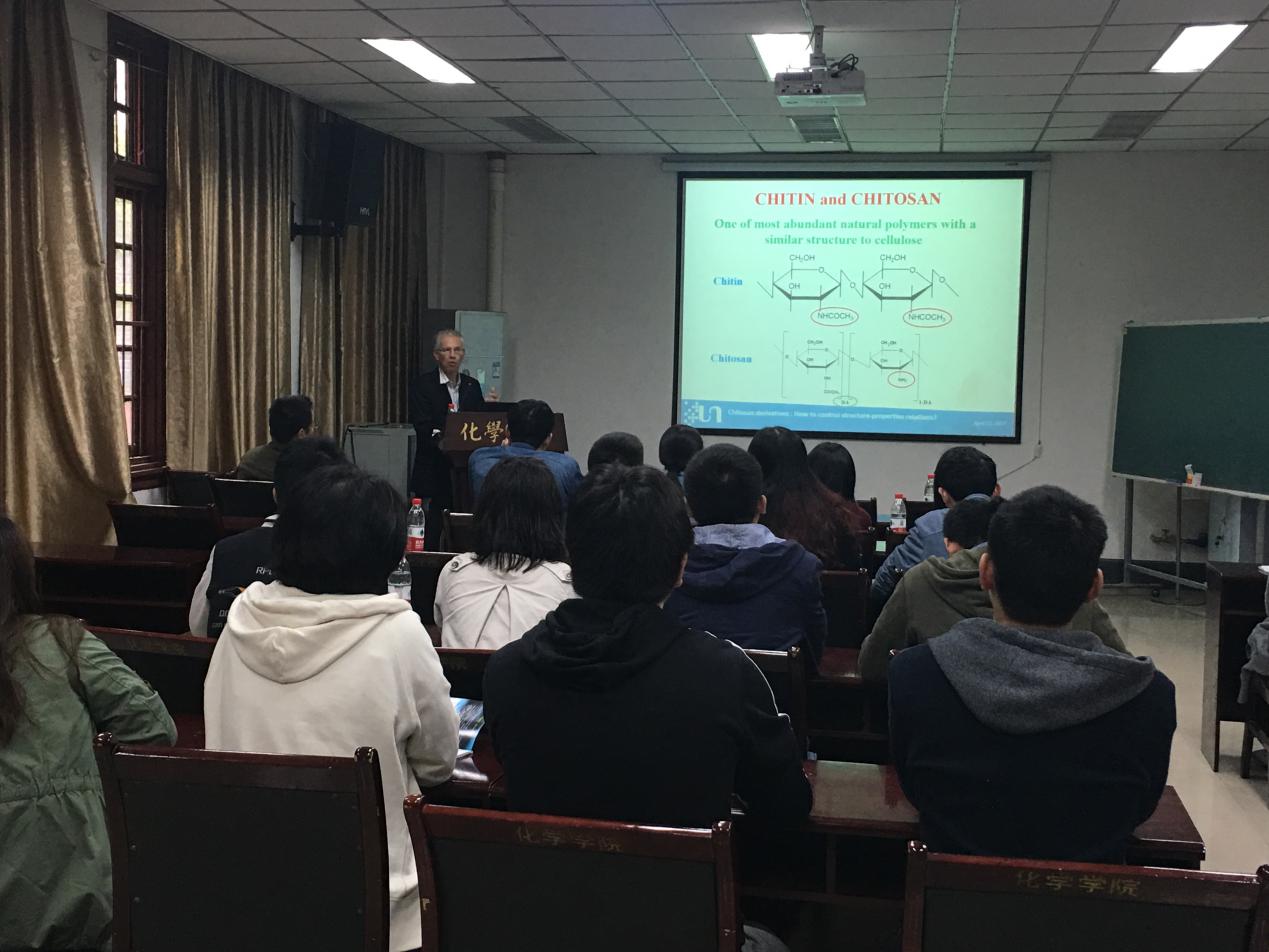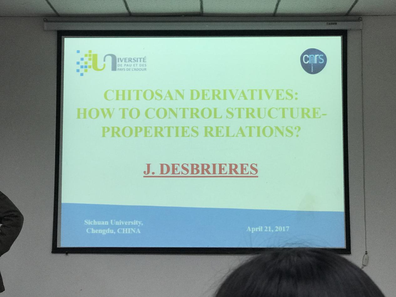 并做了题为“Chitosan derivatives:how to control structure-properties relations?”的学术报告。在化学馆121演播厅,J. Desbrieres教授详细介绍了他的研究小组近年来在壳聚糖的烷基化改性及表征方面的工作,同时也介绍了他们在多糖功能化方面研究的进展。