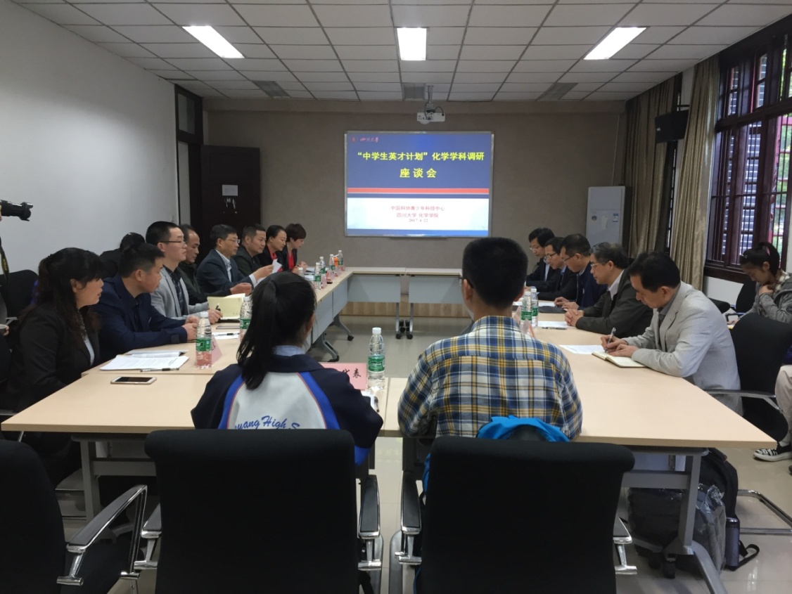 2017年4月22日上午9:00于四川大学化学馆122,“中学生英才计划”化学学科工作委员会来我校调研。中国科学技术大学校长助理、化学与材料科学学院执行院长、“中学生英才计划”化学学科工作委员会秘书长杨金龙教授,中国科协青少年科技中心院校合作处范体宇副处长,英才计划化学学科工作委员会委员:上海交通大学化学化工学院陈接胜院长、南京大学化学化工学院朱成建副院长、合肥一中特级教师李友银、四川省科技馆经戈馆长,四川省青少年科技活动中心夏虹副主任,四川省青少年科技活动中心周津伊科长,四川省参与“中学生英才计划”的中学老师和同学代表和四川大学教务处、体育网足球即时比分