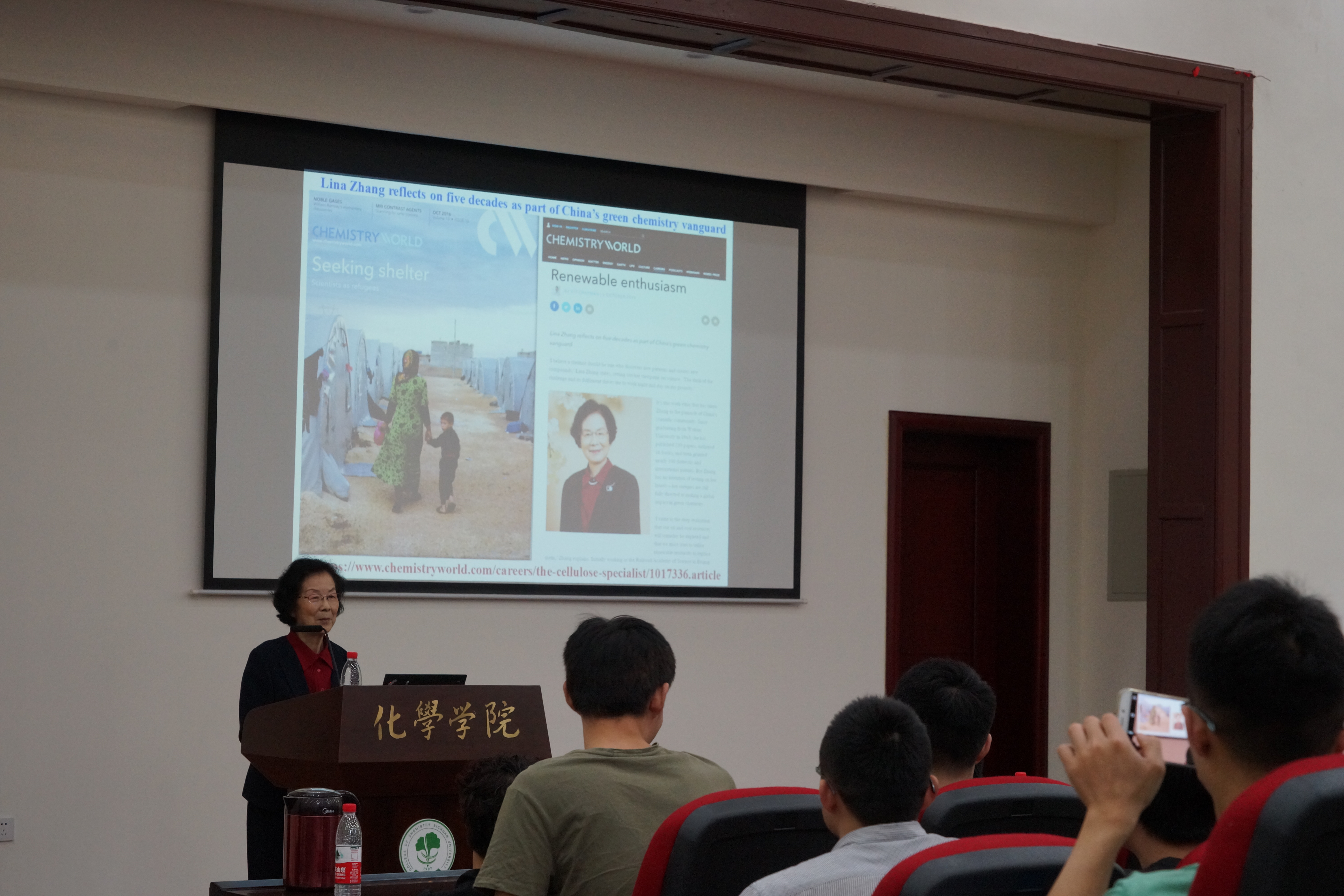 的师生,高分子学院等其他学院的师生也慕名而来。张俐娜院士重点介绍了纤维素、甲壳素、壳聚糖等难溶解大分子的低温溶解过程和机理,以及利用该方法构建出的系列新型功能材料,深入揭示了材料结构和性能的关系,并对其工业化应用进行了展望。最后张俐娜院士还特别强调做科研一定要勇于坚持。结合自身的科研经历,张俐娜院士坦承自己创新的激情来源于对祖国和科学的热爱,爱是自己前进的动力。张俐娜院士的报告内容丰富,讲解深入浅出,激发了在座师生的浓厚兴趣。讲解过后,张俐娜院士和现场的老师、同学们进行了多方面的交流与讨论。最后报告在热烈的掌声中落下帷幕。
