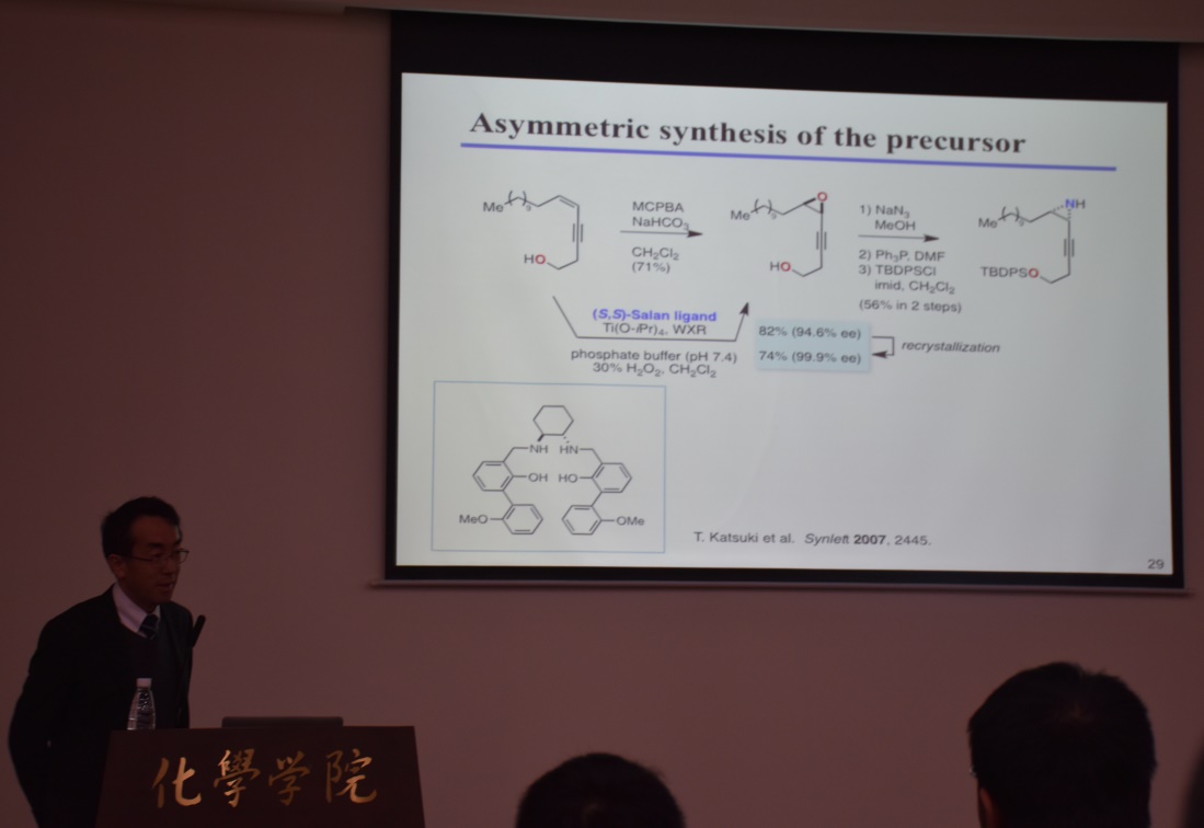 邀请,日本名古屋大学Toshio Nishikawa教授访问四川大学并进行了学术交流。在化学馆321报告厅,Toshio Nishikawa教授详细讲解了该课题组通过连续环化反应构建STX骨架的策略,基于该策略,简洁高效合成具有生物活性的Saxitoxin(STX)天然产物,另外还介绍了 Crambescin B COOH和Chaxine B两个天然产物的详细合成路线,它们具有与河豚毒素TTX类似的生物活性。此次报告会由体育网足球即时比分