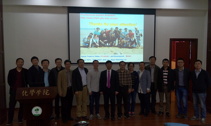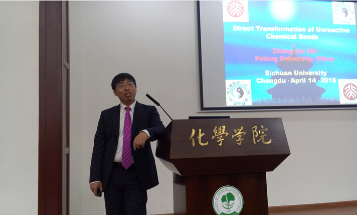邀请,北京大学施章杰教授访问四川大学并进行了学术交流。在化学馆321报告厅,施章杰教授做了题为“新一代物质转化途径”的学术报告。报告中,施教授介绍了其课题组在过去十几年中在C-H/C-O键活化领域所做的开创性工作与所取得的丰硕成果。针对C-O键活化领域,施教授讲述了酯类C-O键的选择性活化以及基于“相互活化”理念实现的酚类惰性C-O键的直接偶联反应。此外,施教授从化学公司提供的错误原料开始,详细讲述了该课题组在惰性C-H键活化领域的发展史,针对该领域存的重要挑战和科学问题,从导向的邻位碳氢键卤化反应到芳基化反应,从有机金属试剂到普通芳环参与的氧化偶联,从贵过渡金属到普通金属甚至无过渡金属参与的C-H键转化反应,从偶联反应到对醛酮亚胺的加成反应。施教授报告内容丰富,讲解深入浅出,幽默风趣,妙语连珠,并且以实验室真实的一些故事鼓励在场的每位同学,在未知领域要敢想敢做,勇于创新,严谨细致,态度决定一切(不要以证明导师想法是错误的为动机),设定较高目标,将自己个人的发展与实验室的长期目标和理想紧密关联,加强和导师的沟通和交流,茁壮成长。