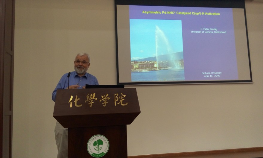 邀请,瑞士科学院院士、瑞士化学会前任主席Peter Kündig教授访问四川大学并进行了学术交流。在化学馆321报告厅,Peter Kündig教授做了题为“不对称Pd-NHC*催化sp3C-H键活化:吲哚啉的合成”的学术报告。报告中,Kündig教授介绍了其课题组的整体研究情况,尤其是在不对称Pd-NHC*催化sp3C-H键活化合成吲哚啉领域所做的开创性工作与所取得的丰硕成果。Kündig教授主要研究领域集中在有机合成与过渡金属催化剂,例如不对称C-H活化,手性铁和钌路易斯酸催化剂,手性二胺催化剂和平面手性金属配合物的合成。Kündig教授报告内容丰富,讲解深入浅出,幽默风趣,除了在学术科研上的交流,Kündig教授还在报告过程指出未来是属于年轻人的,鼓励在场的每位同学在未知领域要敢于挑战自我,解决相关研究领域中存在的根本问题,通过艰辛的努力一定会取得相应成果。Kündig教授的报告内容新颖,讲解深入浅出,激起了在座老师和同学的浓厚兴趣,报告在热烈的掌声中落下帷幕。