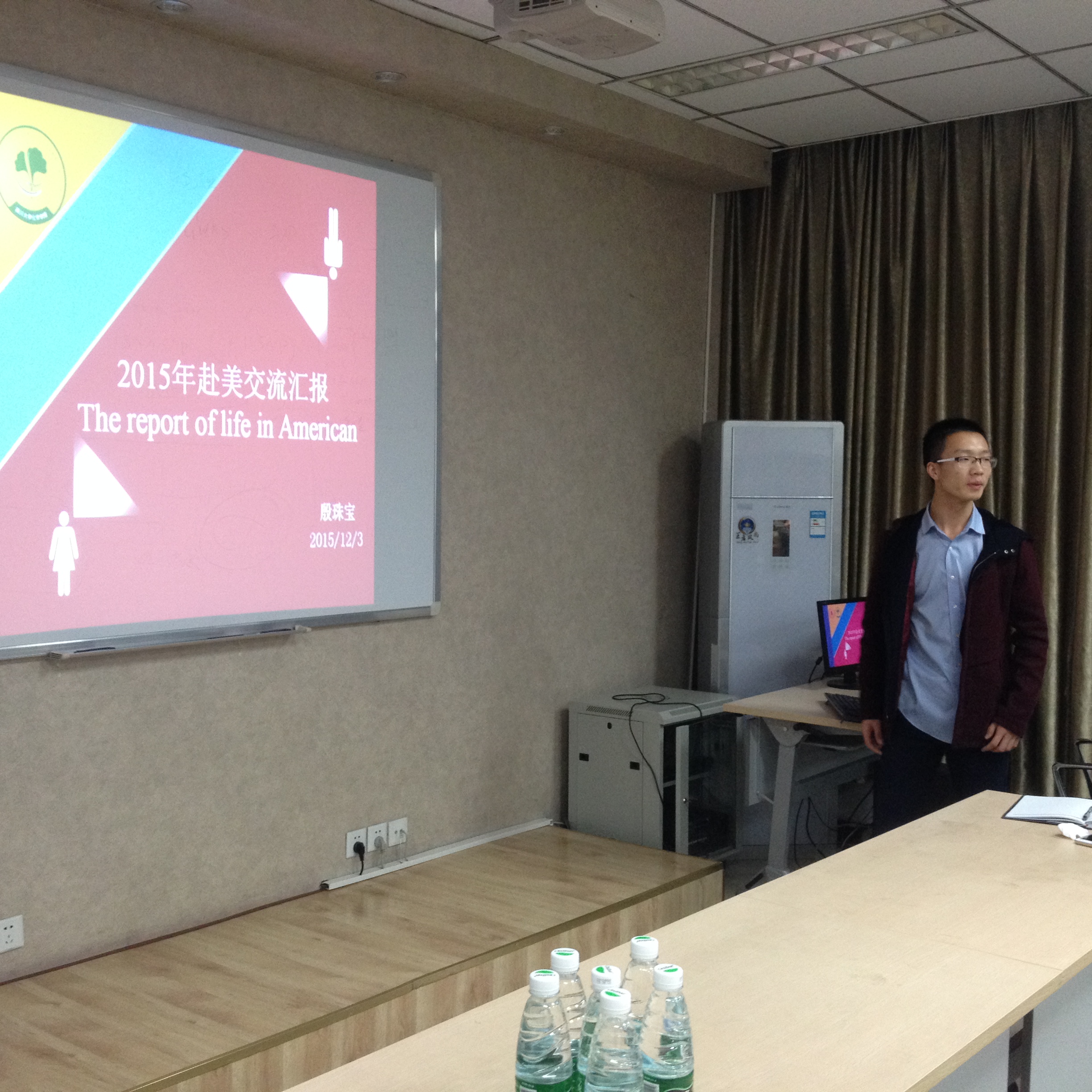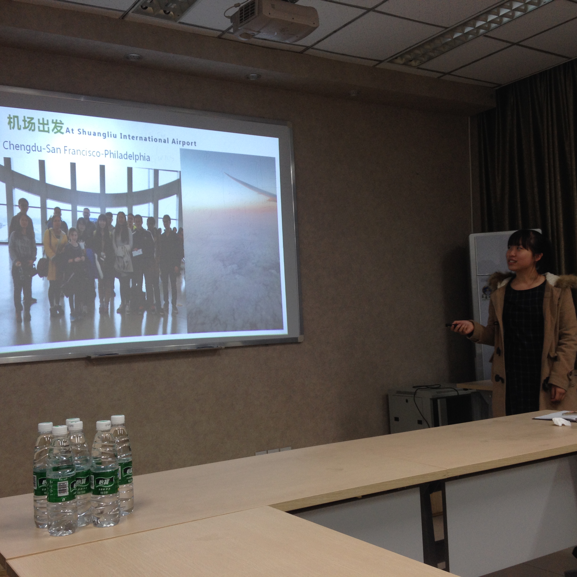 汇报会开始,Jason Chruma教授总结了此次美国之行的总体情况,接着同学们依次汇报,从美国高校校园环境、课堂氛围到科研活动、实验室仪器设备等诸多方面发表了自己的看法,并对于学院今后的发展提出了自己的建议。2013级殷珠宝同学率先发言,从“所感”、“所想”、“所悟”三个方面进行了汇报,对什么决定科研效率、什么是理想的科研氛围等提出了自己的看法。黎郭平同学通过本次交流,提出希望能够培养更具学科交叉能力、具有鲜明川大烙印的学生,加强不同学院之间及内部的科研合作,引发了热烈的讨论。2012级谢媛婷同学根据访学的见闻,提出了自己在改善课堂与考核方式方面的想法,希望能够多开展学术讲座等活动,让更多的人从科普的角度认识并了解化学。刘洋同学结合当前实际与自身情况,对在访学过程中的课堂内容、美国文化谈了自己的想法。此外,薛玥、卢智鹏、黄巍、任佳玉、袁闻励、何鑫等同学向大家展示了美国高校实验室、仪器设备以及校园风光,并与大家交流了自己的收获与思考。与此同时,同学们也对于学院给予自己本次难得的赴美交流机会表达了感谢,对此次带队的Jason Chruma教授及三位随行老师在访学过程中的关心与帮助表达了深深的谢意。在汇报过程中,同学们提出的想法与建议内容丰富,引发学院领导和老师们的热烈讨论。