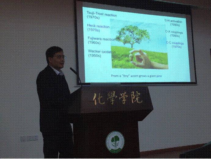 作学术交流,下午四点在化学馆321会议室作了学术报告,题目为“Exploration of palladium catalysis: discovery and surprise”。周教授首先介绍了他带领的课题组在钯催化自由基偶联取得了一系列的成果,克服了Minisci反应收率低、选择性差的缺点;随后介绍了两类商业易得配体DNPF和(R)-Xyl-SDP(O)在钯催化不对称Heck反应中的应用,可催化合成已商业化的药物分子;然后介绍了课题组在过渡金属催化的不对称偶联和高选择性的Michael加成方面取得的进展,并提出了新的反应机理。体育网足球即时比分