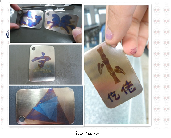 活动第一阶段是社团创意工作室的带头人王云岭同学对活动流程进行介绍,在带领大家解读其中奥妙后便开始进行演示。首先开展的是指纹提取活动,利用茚三酮法在一方小小的白色纸片上显出紫色的纹印;而异氰丙烯酸乙酯法(即502法)本是一个缓慢的过程,可以通过加热加速这个过程,但成功率相对较低。大家最期待的还是金属刻蚀环节,在王云岭同学演示过后,同学们就立即将自己设计的图案画在滤纸上,再用剪刀将剪下,在钛片上拼好后,用磷酸二氢钾溶液浸润后进行电解操作。多变的色彩,多样的设计,有人写上了自己的名字,有人画上了笑脸……欢声笑语中不乏交流讨论。
