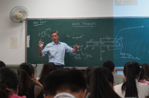 为给我校本科生带来内容和形式上充分的国际化体验,本门课程延续了在加州大学圣巴巴拉分校上课的传统模式,由两位教授共同讲授。两位教授授课内容各有侧重,风格多样,为学生带来多元化的学术交流感受。Bazan教授在课堂上图文并茂地为学生们普及了有机发光二极管,薄膜晶体管,有机太阳能电池等光电半导体材料领域的一些基础知识及基本原理,并展示了自己课题组在相关领域的优秀研究成果;Read教授通过列举生活中的实例让同学们对聚合物产生浓厚的兴趣,接着对聚合物的聚合方式、生长方式和终止进行详细讲解,层层推进。最后分析怎样合成准确的聚合物分子并介绍近年来实验室合成精确定义的聚合物在药物载体方面的应用。