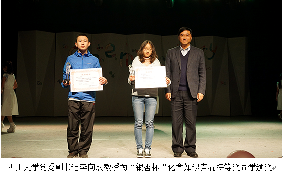 共同主办的四川大学第一届“银杏杯”化学知识竞赛有全校近800名来自24个学院的大一同学参加,收到好的效果,也受到了同学们的好评。随后,四川大学党委副书记李向成教授致辞,李向成副书记讲到化学与我们现代人的生活息息相关,鼓励在座的所有同学都要像谢校长讲到的,要有真学问。也希望我们所有热爱化学的同学们能够做好学问,并用自己所学做有益于社会的事!随后郭勇教授宣读获奖同学名单,领导们向同学们颁奖。至此,四川大学第一届“银杏杯”化学知识竞赛圆满落下帷幕!