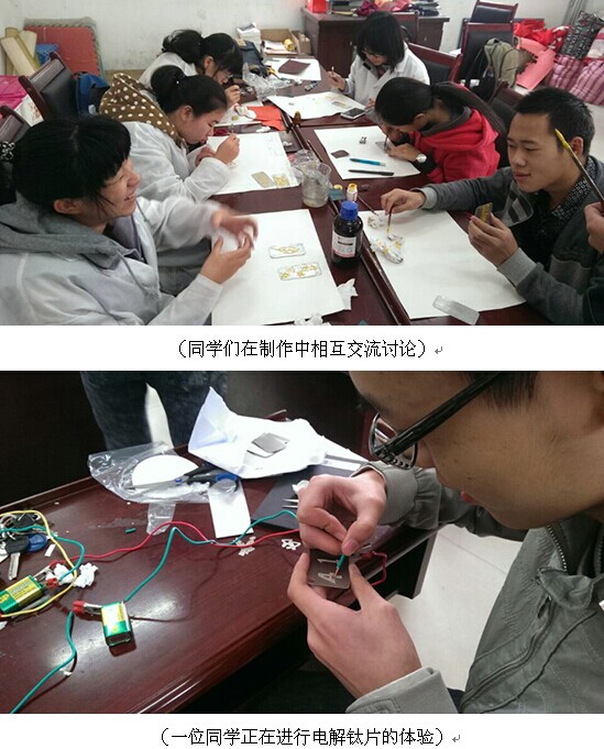 活动分为两个时间段,早上9:00-11:00为电解钛片,10:30-12:30为刻蚀铝片。活动开始前均有求索社创意工作室的部长王云岭同学向现场的同学展示实验如何进行,并讲解其中原理及注意事项。