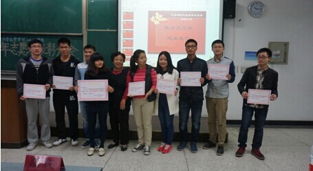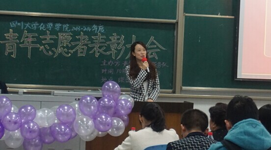 团委书记来俏老师做总结,对青志提出“新的高度,新的挑战,新的突破”要求,并宣布优秀志愿者和优秀班级小分队名单,35位同学和2013级101小分队得到表彰。在热烈的掌声中,郭明秀老师上台为获奖的志愿者们颁奖并合影,从郭老师关切的眼神里,我们看到了她对这届青年志愿者的赞赏和对新一届志愿者的期望。