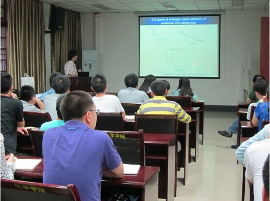 报告中,Fukuhara博士向在座师生展示了其如何利用超分子作用对二肽衍生物进行手性区分及如何在众多糖中实现对阿卡波糖(Acarbose)的特异性识别。报告内容十分精彩,ppt很生动,Fukuhara博士讲解深入浅出,激起了在座老师和同学的浓厚兴趣,报告在热烈的掌声中落下帷幕。报告结束后,Fukuhara博士和现场的老师、同学们进行了热烈的交流与讨论。
