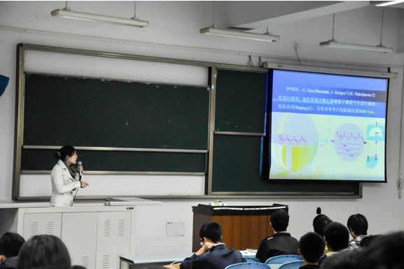 讲座开始,卢教授首先展示了一种超薄显示器,引起了同学们的兴趣。然后,在讲解有机光电子材料的发展历程中重点介绍了三位对该学科具有重大贡献的科学家。接下来,卢教授从导电聚合物讲起,介绍了导电高分子材料的研究历程,其中对聚乙烯、石墨烯、太阳能电池等进行了重点介绍。卢教授幽默风趣的语言赢得了现场观众雷鸣般的掌声,活跃了讲座的气氛。最后,卢教授与同学进行互动,耐心且详细地解答了同学们提出的问题,并鼓励同学们课后与他进行更深入的交流。