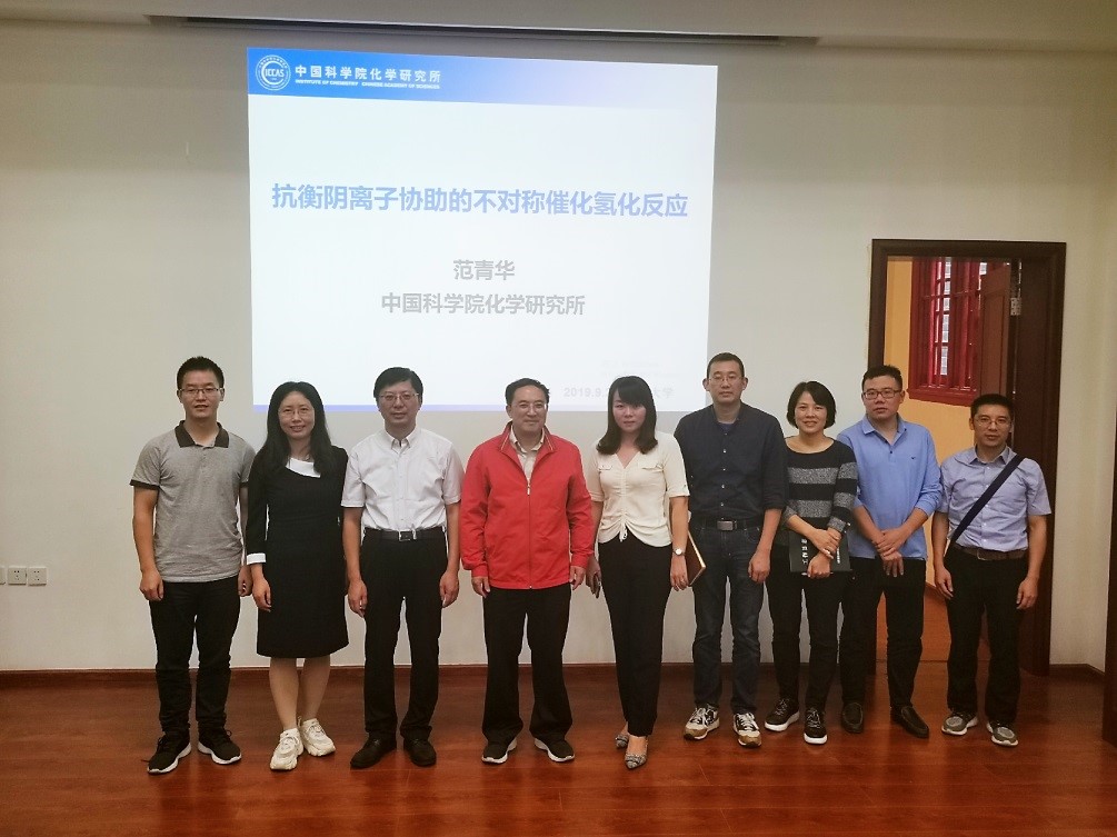 在报告中,范青华研究员首先介绍了不对称催化氢化研究的发展历程以及所面临的机遇和挑战。针对该领域的科学问题,他们首次提出了“抗衡阴离子活化”策略率先解决了芳香杂环的不对称氢化问题,实现了系列芳杂环化合物的高选择性不对称氢化;发展了一系列还原氨化和串联反应等,建立了合成大位阻非对称手性卡宾化合物的新方法。此外,范老师还回顾了自己攻读博士阶段的科研经历,他坚持不懈的科研精神鼓舞和感染了在场的所有师生。范老师的报告内容丰富,条理清晰,讲解深入浅出,引起了师生们的广泛兴趣。报告后,在场师生与范老师进行了深入的交流和讨论。报告在大家的热烈掌声中落下帷幕,结束后部分老师与范青华研究员合影留念。