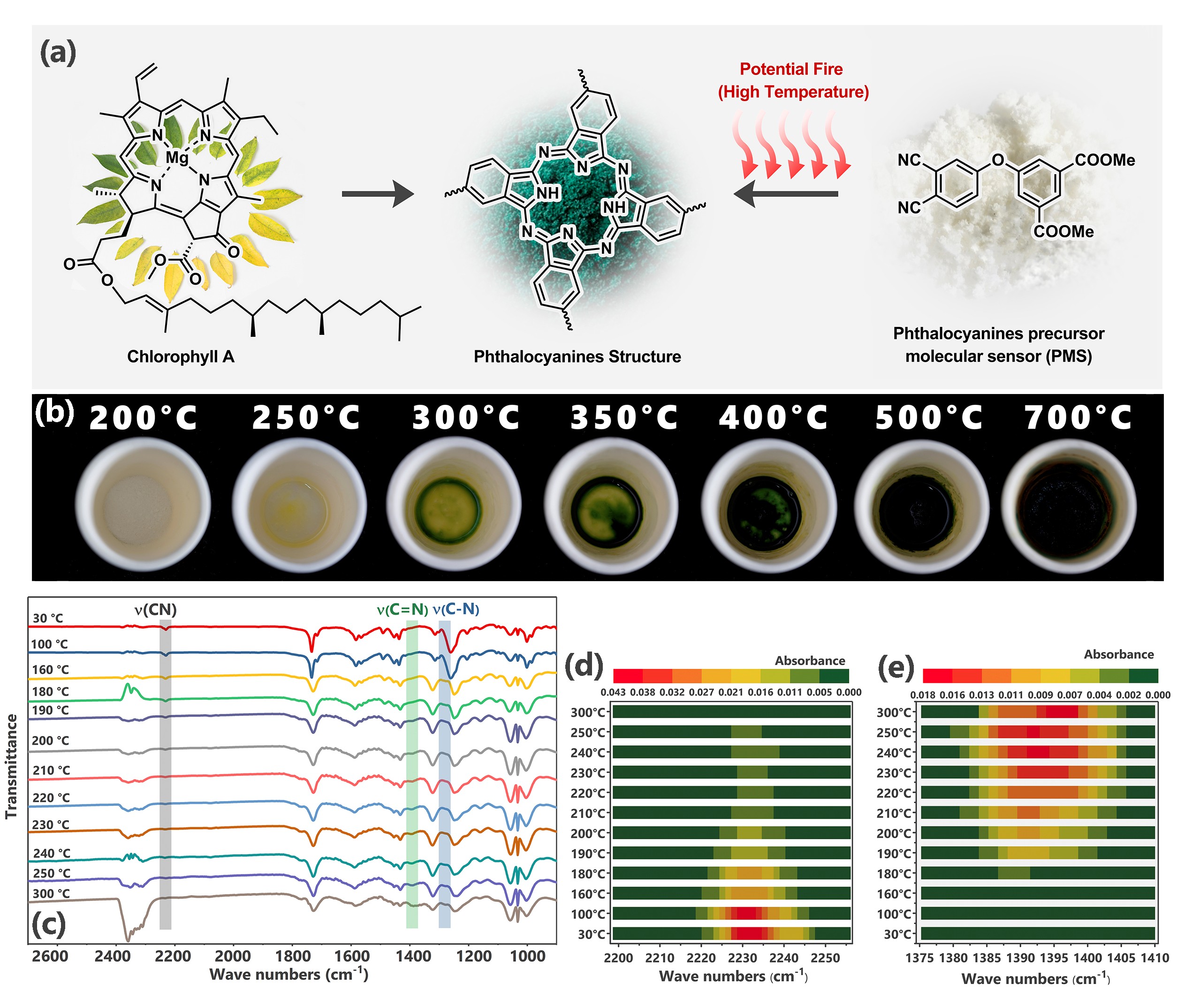 植物体内叶绿素的合成与分解代谢受到外界环境(光、温度等)的影响,并导致植物叶片发生颜色变化。受此启发,作者设计出可在高温下发生化学结构转变,形成与叶绿素结构类似的酞菁环结构的邻苯二腈作为分子传感器PMS(图2)