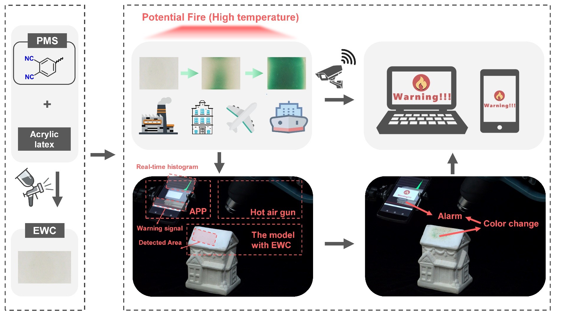 四川大学王玉忠教授团队受到自然界中的植物叶绿素的代谢和分子结构启发,设计制备出可在潜在火灾的高温下发生智能变色的分子传感器(Precursor Molecular Sensor,PMS),并将其与图像识别算法相结合,发展了一种防火于未燃的极早期潜在火灾和早期火灾的探测预警技术,可实现20s内潜在火灾高温响应(275°C)和3s内明火预警(预警技术示意图如图1所示)。