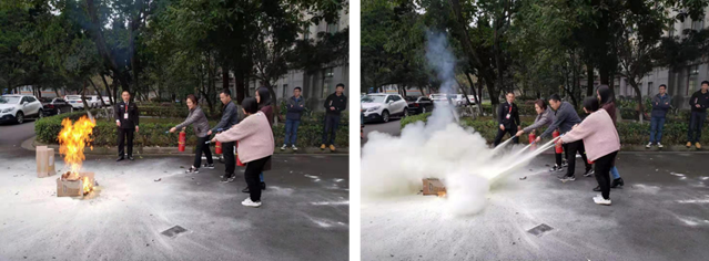 讲座结束后,周教官在第一理科楼前示范了干粉灭火器的正确使用方法,在场师生也分批次进行了实战操作。