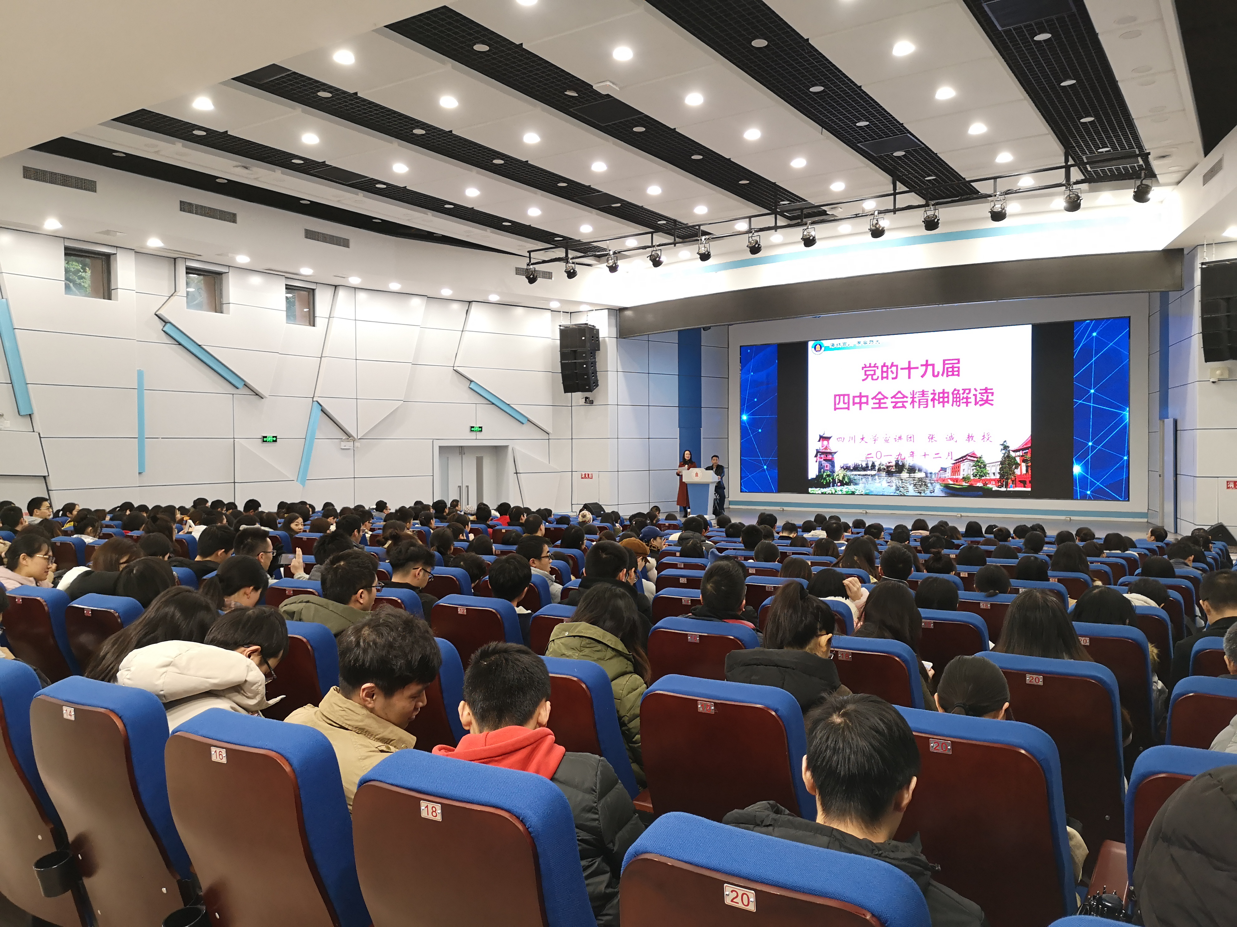 在望江校区东三教演播厅举行“党的十九届四中全会精神宣讲报告会”,特邀学校宣讲团专家张诚教授主讲。报告会由学院党委副书记谢均同志主持,学院领导班子成员和师生职工党员300余人参加了宣讲报告会。