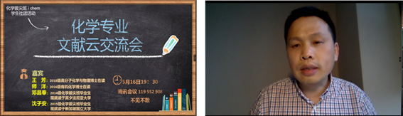 化学拔尖学生i chem社团旨在为本科生提供一个学术方面交流分享的氛围,带动影响更多的同学爱上化学。经过社团成员的共同努力,51619:30化学专业文献云交流会准时上线,本次会议由2019级拔尖班邱江国同学主持。