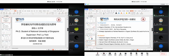 第四位是来自2015级化学拔尖班的沈子安同学(现国立新加坡大学读博)向大家介绍了自己的研究领域手性催化与不对称合成的讨论与思考,从手性催化的发展,到手性自催化与手性起源,最后为大家提供了有机化学的学习建议。