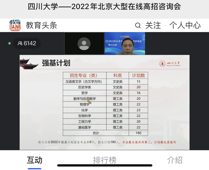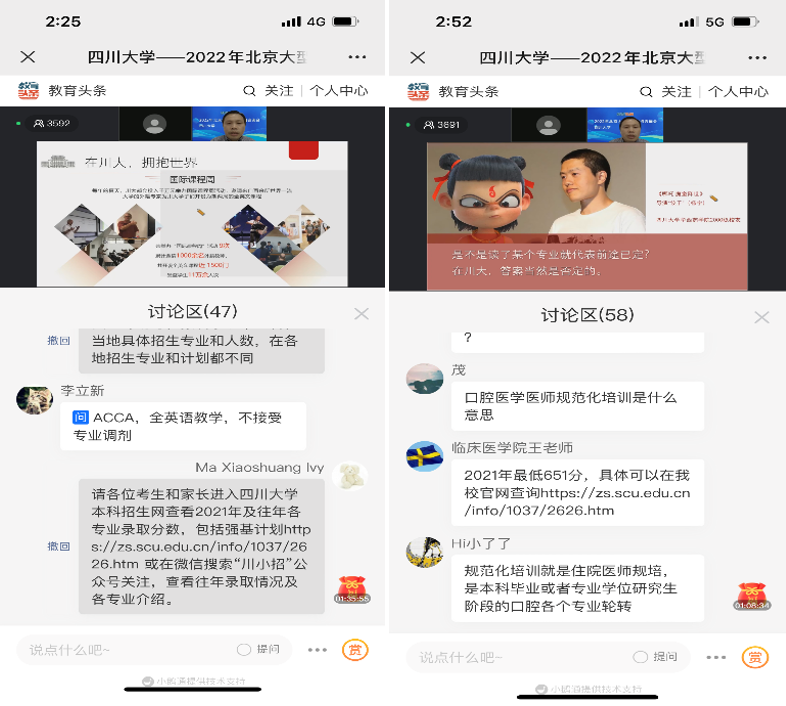 、华西临床医学院、华西口腔医学院、匹兹堡学院等院系招生组老师参与了线上答疑,与北京地区的考生和家长积极互动。本次参与线上宣讲的考生及家长达6000余人次。