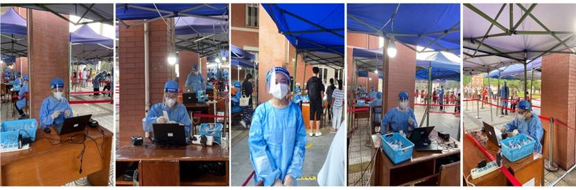 第二批和第三批教师志愿者参与了学校核酸检测的志愿服务工作中。第二批志愿者服务队由李坤、程肖玲、卢伟、万贤楷、徐定国、张金懿、周宇乔7位老师组成,第三批志愿者服务队由李丹、李晓伟、刘双、周宇乔、朱剑波5位老师组成。在现场,他们身着防护服,为学校师生员工做好核酸检测点秩序维护、健康码核查、核酸试管条码录入、流程讲解等工作。