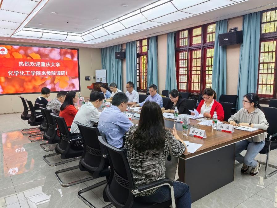 对重庆大学化学化工学院同行表示热烈欢迎,高度评价了两学院长期以来的友好交流,希望双方继续在人才培养、学科专业建设等方面加强合作。郑成斌副院长从学院的历史发展、师资队伍、本科和研究生教育教学现状、科研平台等方面对学院概况进行了介绍。随后,重庆大学化学化工学院副院长谢昭明教授对重庆大学化学化工学院的基本情况、人才建设、学科建设总体思路等进行了介绍。最后,双方围绕即将举行的第四届全国大学生化学实验创新设计大赛西南赛区的相关筹备工作、教学研讨会、化学实验教学中心建设、化学实验教学工作进行了深入的交流和讨论。