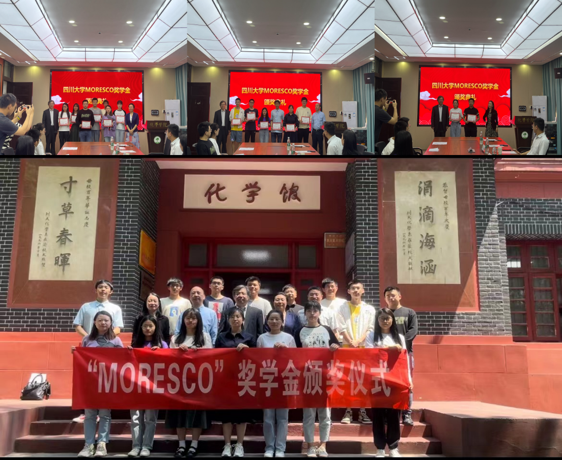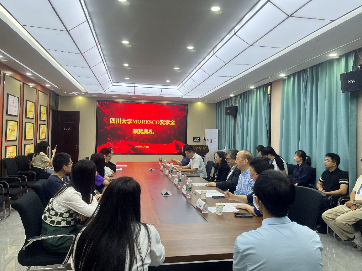 “MORESCO奖学金”颁奖典礼在化学馆122会议室举行。日本MORESCO执行役员、中国区总负责人、莫莱斯柯贸易(浙江)有限公司董事长、莫莱斯柯(浙江)功能材料有限公司董事长、德松科技有限公司董事兼总经理 刘英进先生,成都方夏智能科技有限公司董事长夏初俄先生,四川大学教育基金会副秘书长贾秀娥老师,体育网足球即时比分