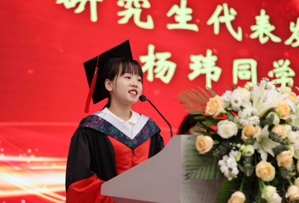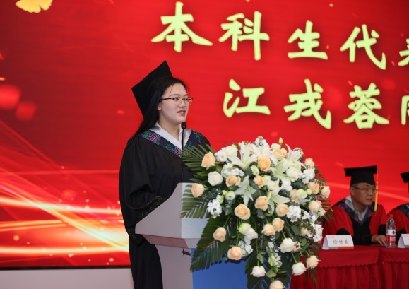 本科生代表江戎蓉、研究生代表杨玮回忆了在学院的求学经历,感恩学院让他们收获了知识与友谊,成长为更优秀的人。最后他们代表全体毕业生向学院和老师们表达了衷心的感谢和“今天我们以学院为荣、明天我们也会努力让学院以我们为傲。”的坚定决心。