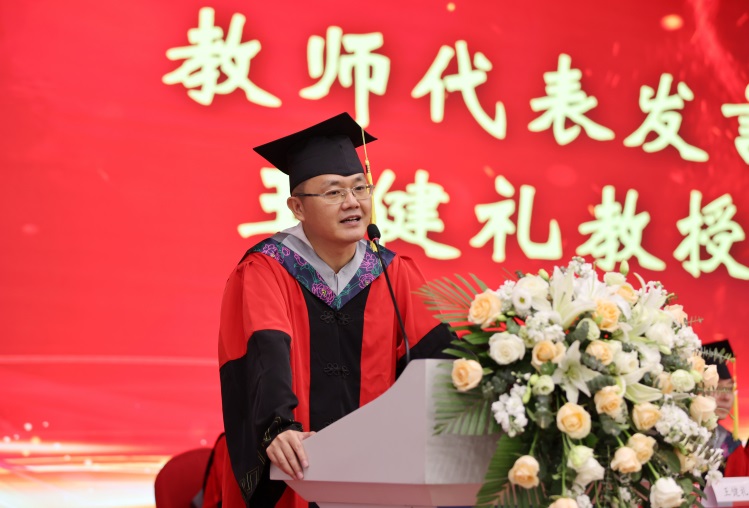 王建礼教授作为教师代表发言,表达了对同学们的祝贺,同时希望大家毕业之后能够继续发光发热,为国家、社会做出贡献。