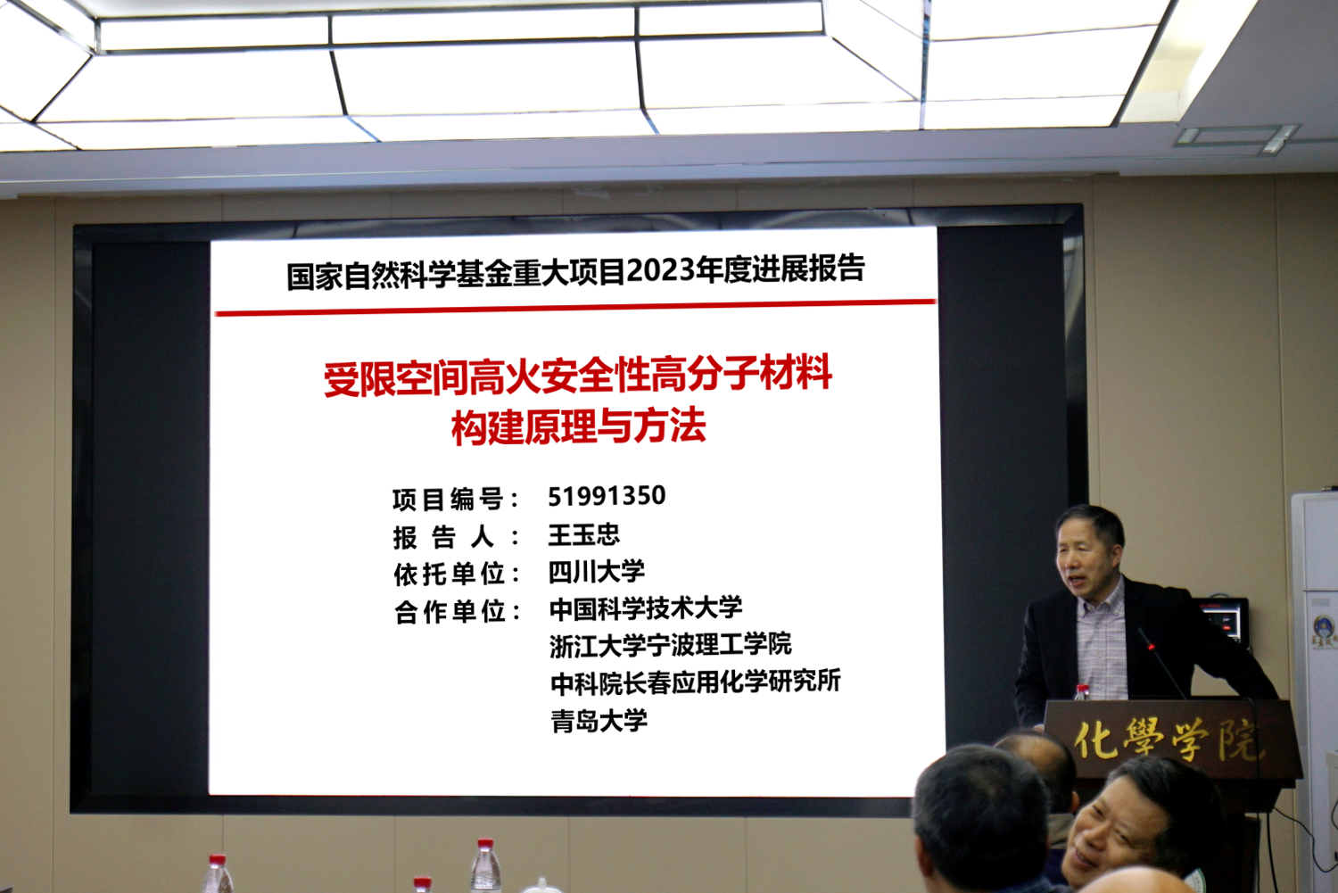 王玉忠院士牵头承担的国家自然科学基金重大项目“受限空间高火安全性高分子材料构建原理与方法”2023年度项目进展报告会于2024年1月15日在四川大学化学馆122召开。国家自然科学基金委工材学部的马劲处长,我校褚良银副校长,重大项目学术指导组专家、以及项目各课题负责人与研究骨干等出席会议。会议由王玉忠院士主持。