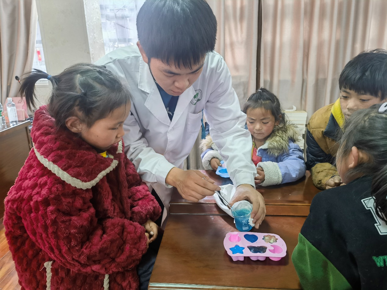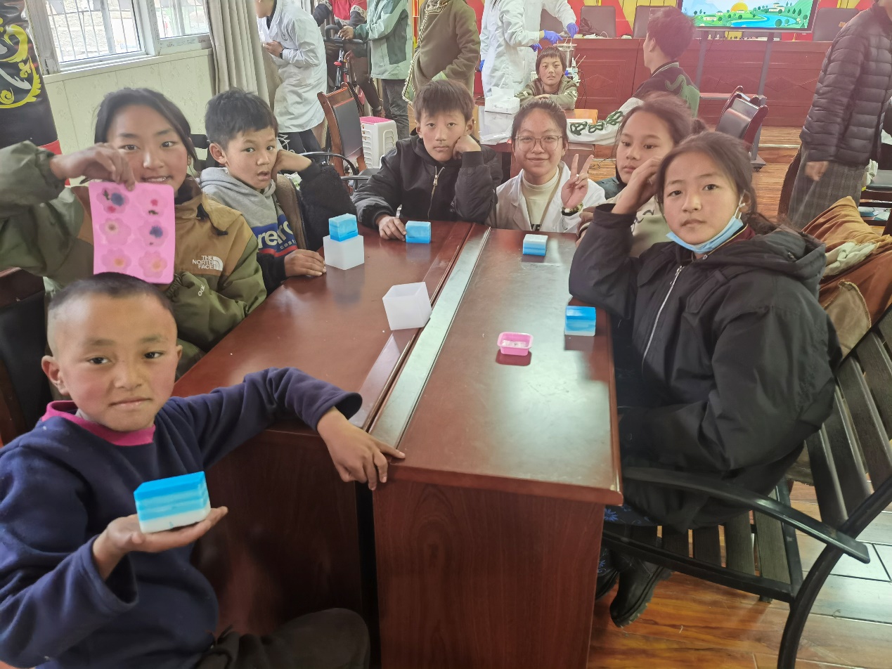 为了让当地学生亲手实践感受化学魅力,本次实践团队延续和改进了手工皂制作活动。团队成员充分考虑当地学生的个体差异和兴趣方向,精心设计了多种手工皂制作模式,包括风景皂、色彩渐变皂、干花皂以及模型皂等,确保每一位孩子都能在实践中收获成长与乐趣。在团队成员的手把手教学下,同学们积极挑战复杂手工皂的制作,山水之景、颜色之变、花朵之态都在手心绽放,孩子们的自豪和成就感化作脸上真挚的笑容。