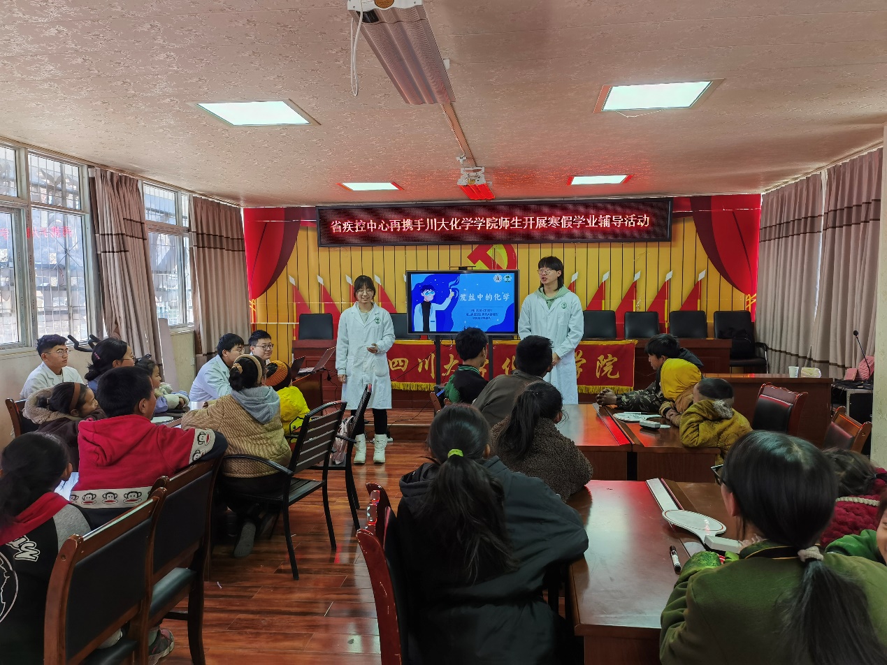 团队成员在壤古村为当地学生开展化学科普讲解和知识问答竞赛活动。为了使化学科普更加通俗化、趣味化,团队成员以生活中的常见现象为导入,以激发学生对化学的兴趣为导向,引导孩子们思考部分自然现象的背后原理,再用通俗易懂的方式进行化学科普讲解,让当地学生今后更加关注生活中蕴含的化学知识,培养孩子们主动探究自然现象背后科学原理的思维能力和探索精神。
