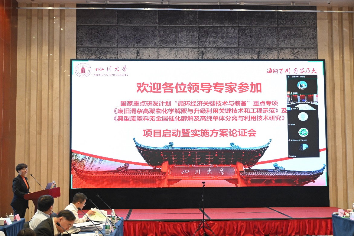 3月11日,由四川大学作为牵头单位承担的国家重点研发计划 “循环经济关键技术与装备”重点专项“废旧混杂高聚物化学解聚与升级利用关键技术和工程示范”及“典型废塑料无金属催化醇解及高纯单体分离与利用技术研究”项目启动会暨实施方案论证会以“线下+线上”方式在蓉召开。中国21世纪议程管理中心、四川省科技厅、项目牵头单位四川大学领导、项目顾问专家组、项目负责人、课题负责人、项目组骨干成员等60余人参加了会议。
