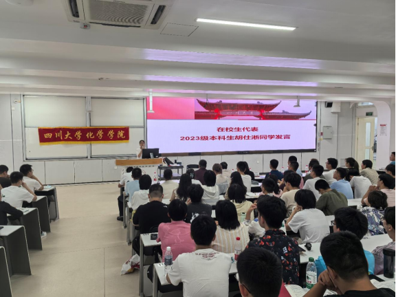 老生代表胡仕淅同学结合自己的学习经历,分享了如何在化学领域中找到兴趣和方向,以及如何平衡学习与生活的经验。他鼓励新生们要勇于提问,敢于挑战,积极参与到学术研究和各类竞赛中,锻炼自己的实践能力和创新思维。新生代表梁宇航同学则表达了对未来大学生活的期待和决心,表示将努力学习,积极探索,为化学科学的发展贡献自己的力量。