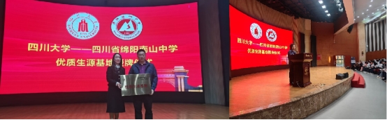 宣讲会在南山中学第二学术厅举行,由南山中学副校长舒峰主持。舒峰副校长对川大宣讲团的到来表示热烈欢迎,谢均书记代表四川大学向南山中学进行“优质生源基地”授牌,南山中学党委书记徐勇接受牌匾并讲话,表示感谢川大长期以来对南山中学的支持,四川大学一直是南山学子向往的高等学府,希望双方在人才培养、学术交流等方面进一步深化合作,共同为国家培养更多优秀人才。
