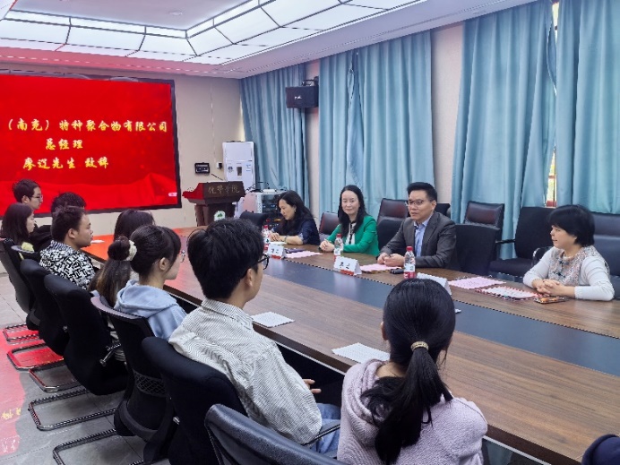 杰出校友、埃夫科纳(南充)特种聚合物有限公司总经理廖辽的到来致以热烈欢迎,并衷心感谢公司对学院的关怀与支持,对公司的蓬勃发展表示欣喜。随后,谢均书记向获奖学生致以祝贺,充分肯定他们的辛勤努力与优异成果,并全面介绍了学院的发展状况、取得的成绩、未来计划及人才培养等情况,并为埃夫科纳奖学金的捐赠人廖辽颁发了捐赠证书。