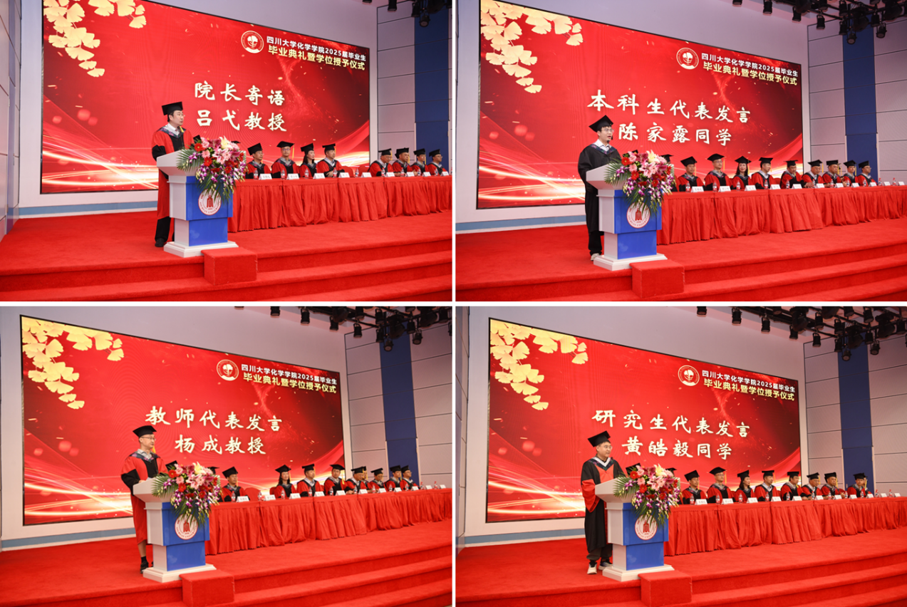 本科生代表陈家露同学和研究生代表黄皓毅同学在发言中深情回顾了在学院的学习时光,感恩学院为他们提供了宝贵的学习资源和广阔的发展平台,让他们在学术探索中不断进步,在能力素养上持续提升,最终成长为更优秀的自己。他们代表全体毕业生,向学院和辛勤付出的老师们致以最真挚的感谢。