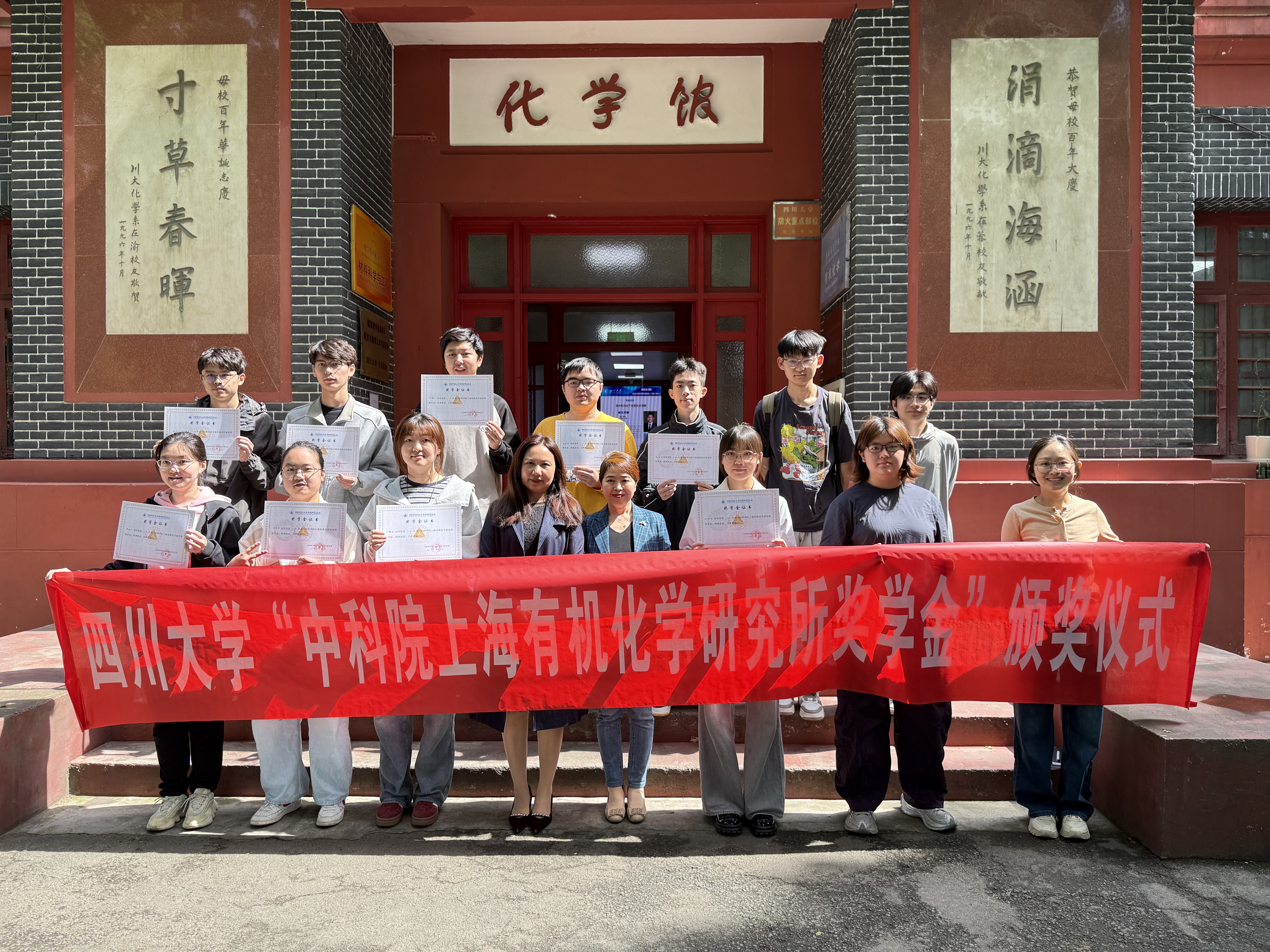 获奖学生代表表示,将珍惜荣誉,继续努力,未来将以更饱满的热情投入到学习与科研中。颁奖仪式结束后,全体嘉宾与获奖学生在化学馆前合影留念。