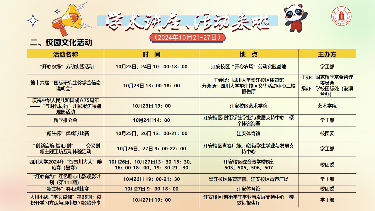 学术讲座论坛及校园文化活动预告(2024年10月21日-27日)