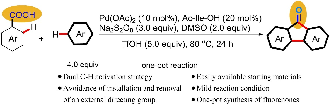 41) Denan Sun, Bijin Li, Jingbo Lan,* Quan Huang and Jingsong You.* Chelation-assisted Pd-catalysed ortho-selective oxidative C–H/C–H cross-coupling of aromatic carboxylic acids with arenes and intramolecular Friedel–Crafts acylation: one-pot formation of fluorenones, Chem. Commun., 2016, 52, 3635−3638.