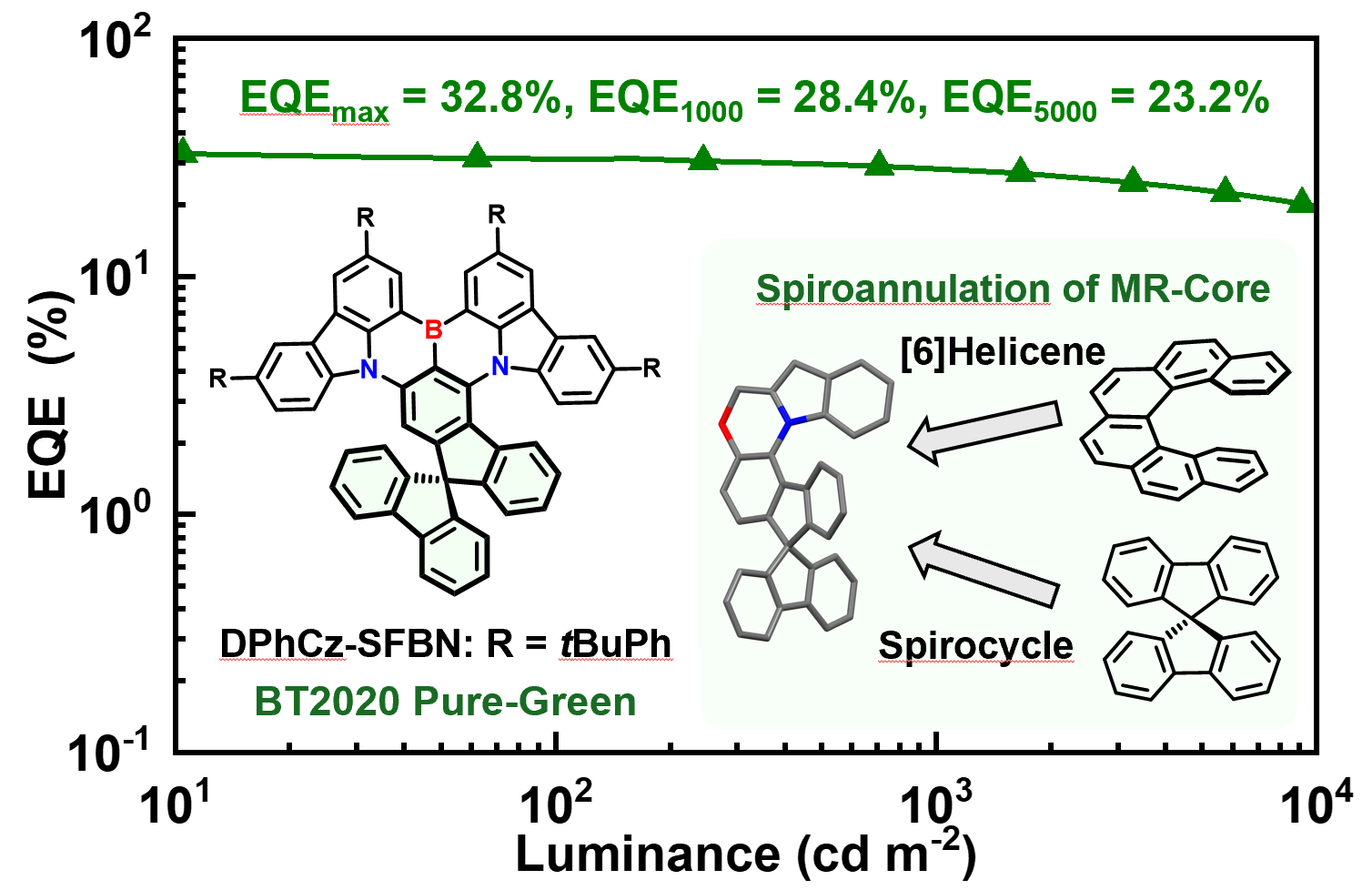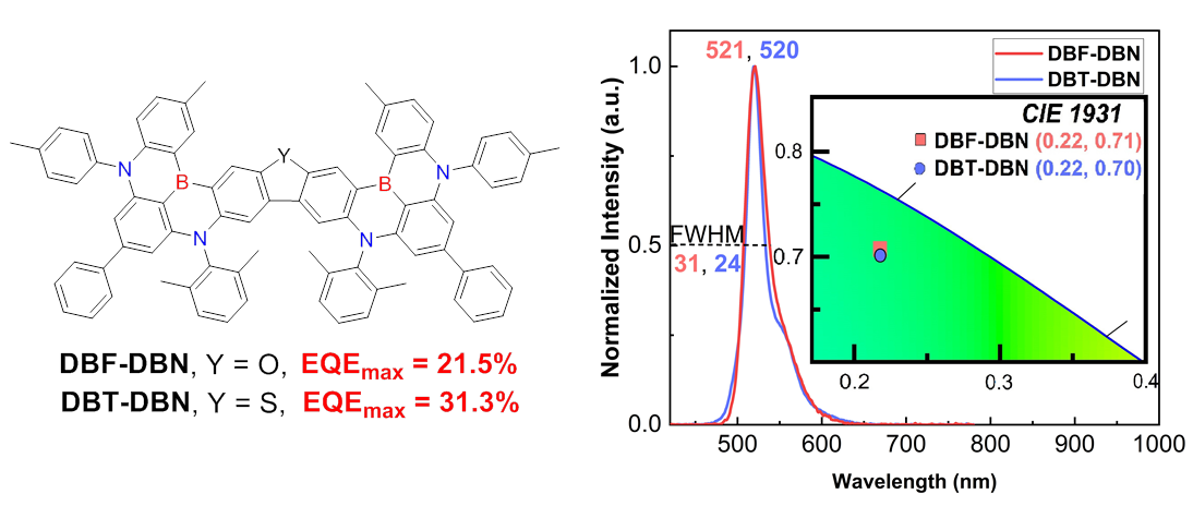 4) Hu Cheng, Jingbo Lan*, Yudong Yang, Zhengyang Bin.* Spirobifluorene-fused strategy enables pure-green multiple resonance emitters with low efficiency roll-off. Mater. Horiz., 2024, 11, 4674–4680.