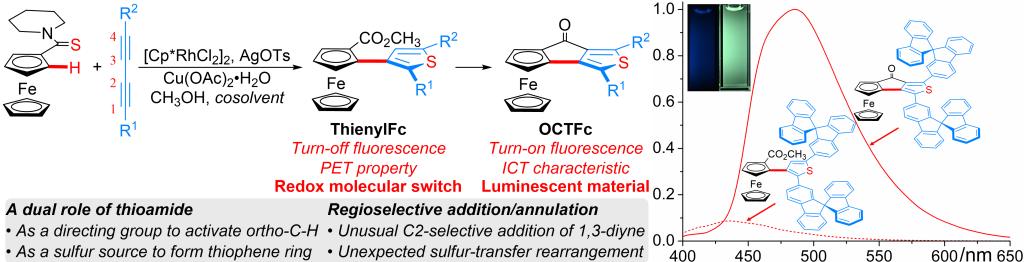 20) Lipeng Yan, Jingbo Lan,* Hu Cheng, Yihang Li, Mangang Zhang, Di Wu, Jingsong You. * Regioselective addition/annulation of ferrocenyl thioamides with 1,3-diynes via a sulfur-transfer rearrangement to construct extended pconjugated ferrocenes with luminescent properties. Chem. Sci. 2020, 11, 11030–11036.