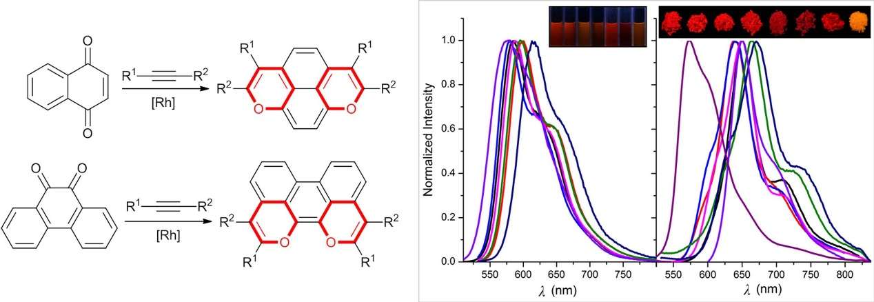 46) Jing Wang, Dekun Qin, Jingbo Lan,* Yangyang Cheng, Shuai Zhang, Qiang Guo, Jie Wu, Di Wu, Jingsong You.* Rh-Catalysed direct cyclization of 1,4-naphthoquinone and 9,10-phenanthraquinone with alkyne: facile access to 1,8-dioxapyrenes and 1,12-dioxaperylenes as orange and red-emitting luminophores. Chem. Commun., 2015, 51, 6337–6339.