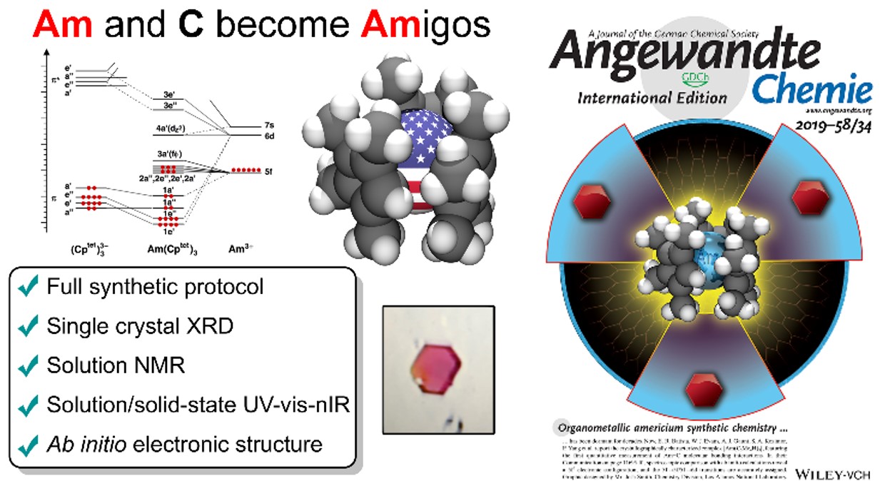 23.Conrad A. P. Goodwin#, Jing Su#(共同第一作者), Thomas E. Albrecht-Schmitt, Anastasia V. Blake, Enrique R. Batista*, Scott R. Daly, Stefanie Dehnen, William J. Evans*, Andrew J. Gaunt*, Stosh A. Kozimor*, Niels Lichtenberger, Brian L. Scott, Ping Yang*. “[Am(C5Me4H)3], An Organometallic Americium Complex”, Angew. Chem. Int. Ed., 2019, 58(34), 11695-11699. (Back Cover)