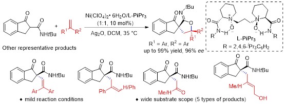 近日,四川大学冯小明教授课题组结合手性双氮氧(L-PiPr3)-Ni(II)配合物催化剂和Ag2O,成功实现了茚酮甲酰胺、酯与富电子烯烃的催化不对称自由基-偶极交叉反应。羰基a位对醛、酮的不对称亲核加成反应在过去几十年被广泛研究。文献报道通过单电子氧化可以实现羰基a位的极性反转,生成亲电型的a-碳自由基,这极大丰富了羰基化学在有机合成中的应用。然而,由于自由基的反应活性高,副反应多,背景反应强等特点,实现高对映选择性不对称催化反应仍具有很大挑战。尽管目前已经发展了一些创造性的催化模式和策略来促进羰基a-碳自由基参与催化不对称反应,但存在催化剂的用量高,催化模式单一,底物的普适性不好,反应结果差等缺点。在本文中,他们利用课题组发展的手性[Ni-L-PiPr3]*配合物作为手性Lewis酸催化剂,高收率、高对映选择性的实现了不对称自由基-偶极交叉反应。各类烯烃和茚酮甲酰胺经历自由基加成、环化反应得到一系列螺环亚胺内脂以及螺环内脂类化合物。同时,根据所使用的富电子烯烃的不同,可以利用同一催化体系得到手性烯烃、醛、酮、醇四种不同类型的产物。在机理研究上,利用TEMPO捕获到了自由基中间体,并且通过自由基钟与EPR实验证明了自由基机理的合理性。